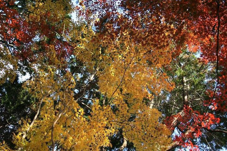見上げると、木漏れ日が紅葉に映えて、