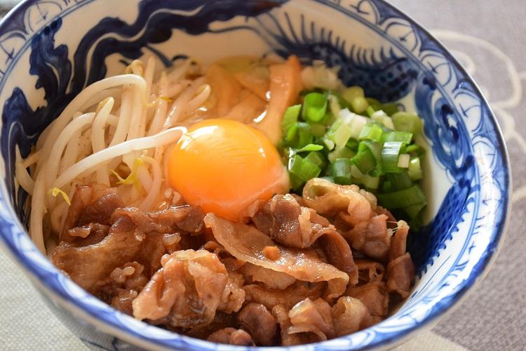 4.炊き上がったご飯に、豚バラ肉の煮汁を少しかけます。 豚バラ肉、もやし、メンマ、青ネギを乗せ、卵を落とします。 出来上がり!