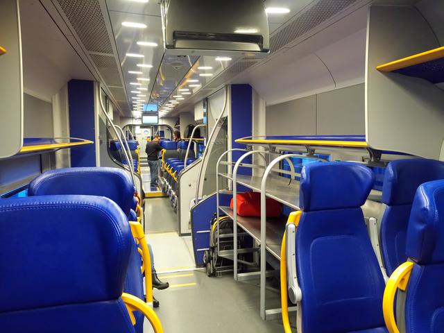 ↑ レオナルド・エクスプレスの車内の様子です。荷物を置くラックもあります。