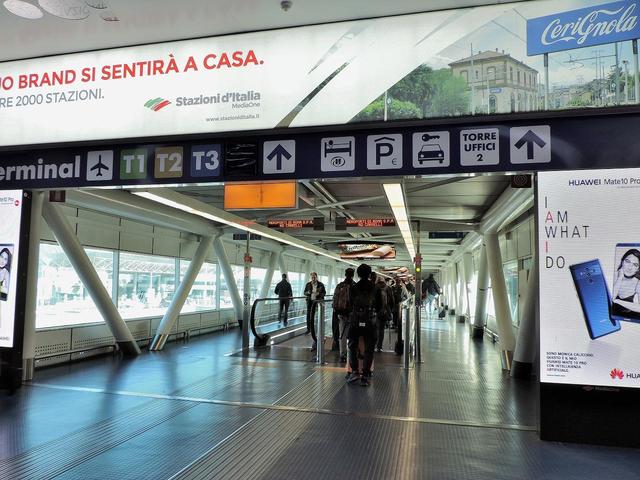 ↑ フィウミチーノ空港は、イタリアで一番大きな空港です。この写真は、ローマ中央駅・テルミニ駅からレオナルド・エクスプレスというノン・ストップの直通列車で到着した時のものです。鉄道駅から空港の入口まで少し歩いて来ました。これから各出発ターミナルへ向かいます。前述の通り、出発ターミナルは全部で3つ(T1、T2、T3)あります。分かりやすい表示が出ています。