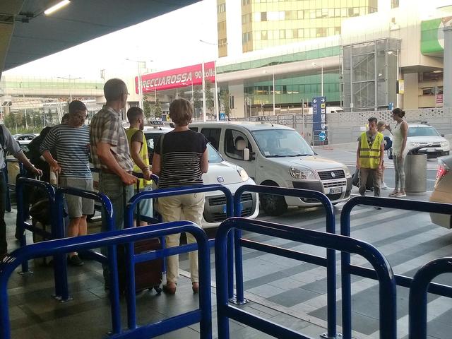 蛍光の黄色のベストを着たお兄さん達が、タクシー乗り場で働いているスタッフで、イタリア語が話せない方のサポート(運転手にイタリア語で行き先を伝える)や、乗車希望人数によって車種をバシバシと振り分けてくれます。