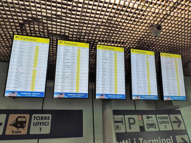 ↑ 空港施設内にはあちらこちらに、今から数時間先までの出発・到着便がどのターミナルに到着するのかが表示されている掲示板があります。これから出発する人も、ローマに到着するご友人を迎えに行かれる方も、まずはモニターでターミナル番号をチェックしてから向かいましょう。このモニターは数十秒おきに表示言語が変わります。今見えているのはイタリア語表記のものです。(イタリア語でPartenzeは出発、Arriviは到着)