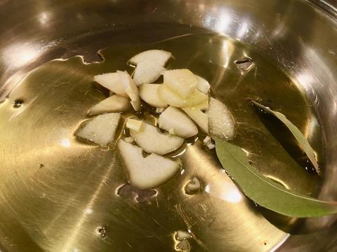 フライパンにオリーブオイル、ニンニク、ローリエを入れ加熱、香り出し。