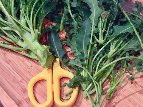 ケールとは言ってもブロッコリーのように太い茎から四方に葉っぱが伸びているので、ハサミでちょんちょん切ってく。 芯も食べられるので小さく切る。 芯の皮は剥いた方が食べやすいかも。