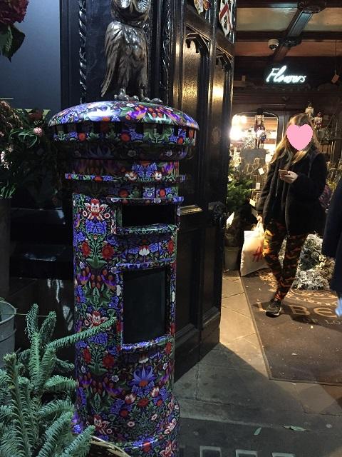 正面入り口にある花屋さんには、こんな花柄模様でラッピングされた郵便ポストが飾ってありましたよ。やっぱりリバティといえば花柄やペイズリー柄ですよね!