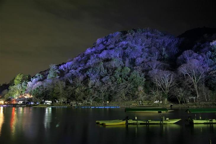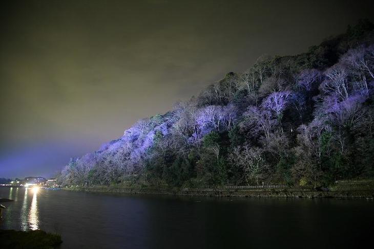 幻想的な薄紫の光に、山々と渡月橋が浮かび上がっています。