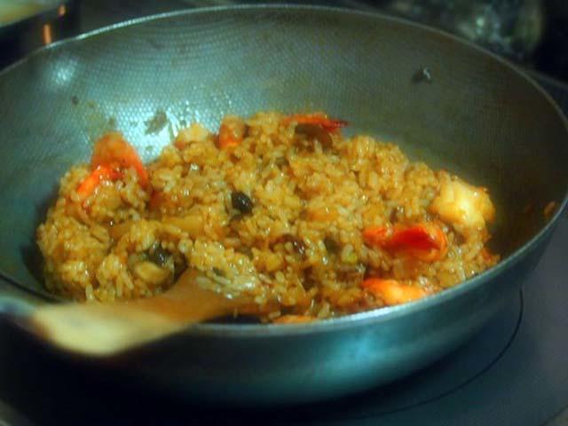 3.海老に火が通ったら、炊きあがったカルローズを入れます。