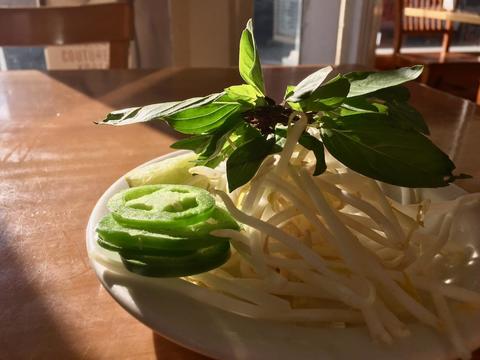 程なく"もやしセット" ハラペーニョの切り口がしっとりしてるのは切り置きじゃないって事。 もやしの下にお水が溜まってないのがきっちり水切りしてあるって事。 タイバジルの茎からは香りがぷ〜んとした。 胃袋はベト麺臨戦体制にはいった!