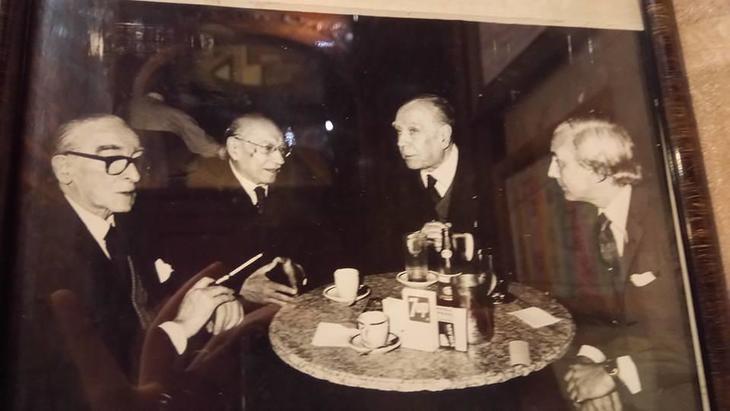 ((ありし日の文豪ボルヘスは右から二人目、お店に飾ってある写真です))