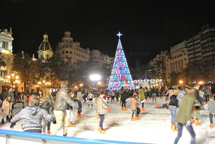 これで3回めになる、今年のバレンシアのクリスマスシーンのご紹介。今回は市役所広場です。この広場はバレンシアの中心となる広場で、クリスマスも気合いが入っています。以前は電飾のツリーと等身大のキリスト生誕シーン"ベレン"が飾られているだけでしたが、数年前からはアイススケートリンクが、そして昨年からはカルーセルも設置されるようになりました(※"ベレン"はレイーナ広場に移動しました)。キラキラまばゆい2階建てのカルーセルは、大人でも乗りたくなってしまいます。ツリーは中がくぐれるようになってるので、ぜひ中に入って見上げてみてくださいね。市役所広場は必見のクリスマスシーンです。
