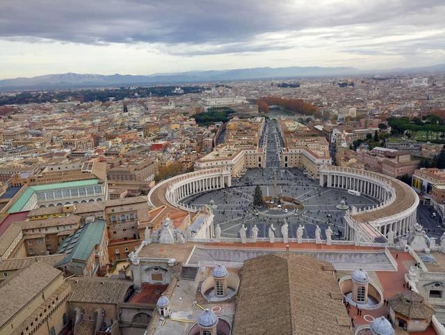 ↑ バチカン市国のサン・ピエトロ大聖堂のクーポラから見たサン・ピエトロ広場です。28メートルのクリスマスツリーの大きさが分かります!この日は曇ってはいましたが、遠くの山がくっきり見えました。