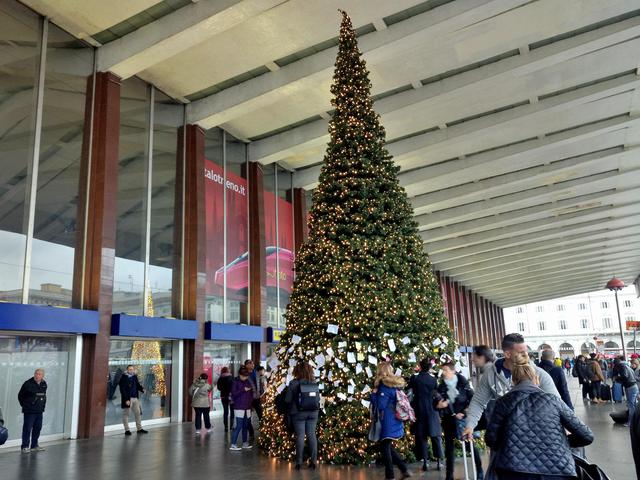 ↑ ローマ中央駅・テルミニ駅です。毎年12月に入ると、駅には大きなクリスマスツリーが立てられます。昨年はクリスマスツリーは駅の中に立てられていましたが、今年はツリーは五百人広場に面した駅の正面に出ていました。ツリーが設置された直後です。今は緑色ですが、だんだんとツリーの様子が変わって行きます!(次の写真)