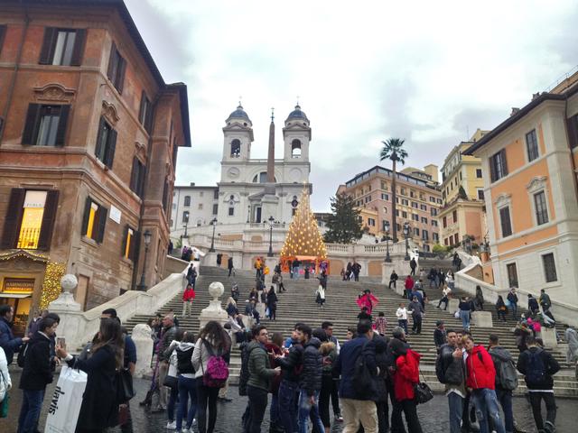 ↑ 続いて、スペイン広場のスペイン階段のクリスマスツリーです。オレンジ色をベースのツリーに星が沢山付いているタイプです。昨年もこの位置に同じ位の大きさのツリーが出ていましたが、数秒ごとにイルミネーションの色が青色、ピンク色、オレンジ色とピカピカ変わる非常にファンタスティックなタイプのツリーでした。今年はややシックです。
