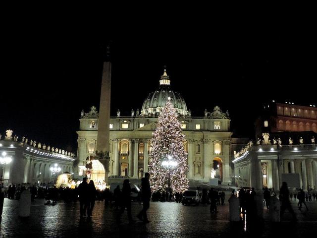 ↑ 最後にご紹介するのは、ローマで最も重要なクリスマスツリーの一つ、バチカン市国のサン・ピエトロ大聖堂前の法王様のクリスマスツリーです。今年の赤モミの木は、ポーランドのエウク大司教区から来たもので、昨年度のものより3メートル高くなっています。こちらの写真は2017年12月7日の夕方の点灯式直後に撮影したものです。ツリーの左横に見えているのはプレゼピオ(キリスト降誕の場面を人形で表現した模型)です。しばしば、クリスマスの期間はツリーと一緒にプレゼピオも飾られます。イタリアでは、主に教会や広場などに飾られています。