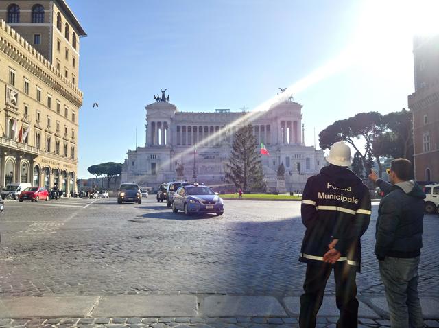 写真の手前側で左に見える建物は、イタリアのゼネラリ保険会社です。建物の中央辺りに、保険会社のシンボルの翼を持ったライオンが見えます。一日中多くの車が行き交うヴェネツィア広場では、交通整理をしているお巡りさん(白いヘルメットを被っているお兄さん)がいます。お兄さんが道を尋ねて来た観光客の方に丁寧に説明しているシーンです!