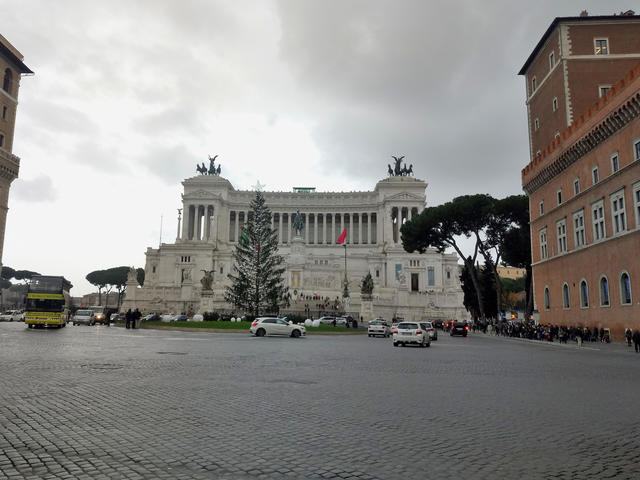 ↑ ヴェネツィア広場に寄ってみました。こちらの広場には、”入れ歯”や”ウェディングケーキ”などと陰口を叩かれもするヴィットリオ・エマヌエーレ2世記念堂(写真中央)があります。丁度今、クリスマスツリーに飾り付けをしているところで、ツリーの左にかすかにクレーンが写っているのが見えます。