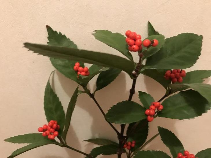 植物の千両と万両とも(他にも百両や十両もあるらしいです。)ギザギザの緑の葉を持ち、赤い実をつけます。