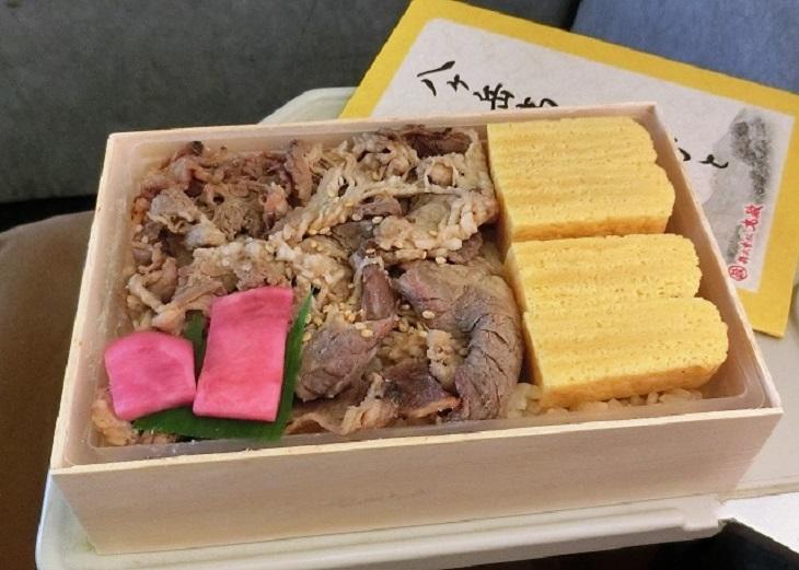 お弁当の中身も、シンプルです。卵焼きと炭火焼肉に赤カブの酢漬けが2枚のみ。甘さ控えめの卵焼き。牛肉は炭火で焼いた香りと味わいを楽しめて、個人的にはとってもおススメしたい一品です。