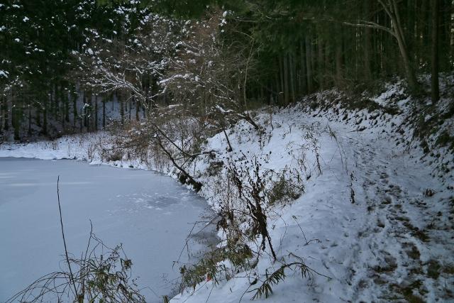 ため池を左手に過ぎ、杉林の中へと進みます。