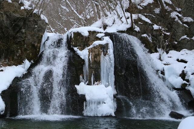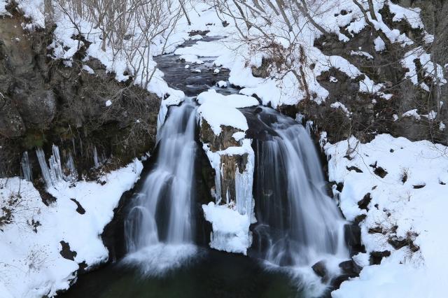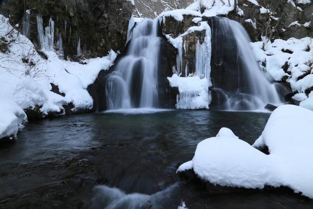 落差は約10mと決して大きくはないものの、二条に流れ落ちる様が美しい滝です。