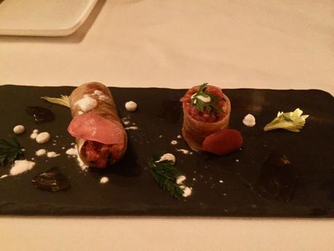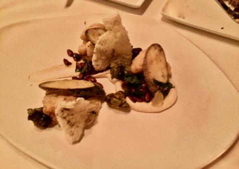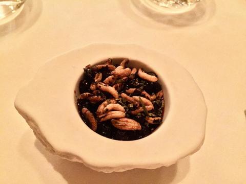 『フォアグラ(Chilled Foie Gras$15)』 炒ったお米にコケモモと一緒にスプーンですくって食べる、お米の食感とコケモモの酸味とフォアグラのまったり感が見事に調和。 冷製でサーブされてるのも珍しかった。