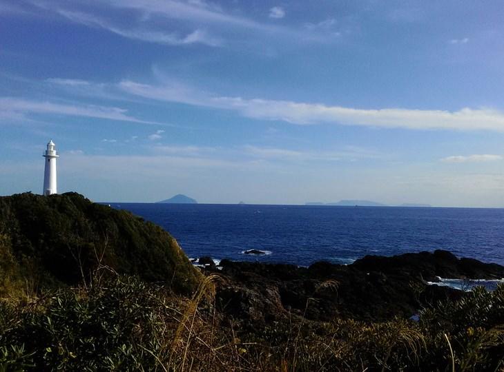 遊歩道は灯台まで散策できるようになっています。この爪木埼灯台は昨年、静岡県で唯一「恋する灯台」に認定されました。ここからは、伊豆七島を一望でき、海の青さ、透明度は抜群です。(ちなみに遠くに見える島は、利島・鵜渡根島・新島・式根島です。)