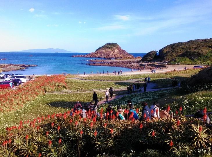 水仙の「白」、アロエの「赤」、海の「青」のコントラストがとても美しい場所です。