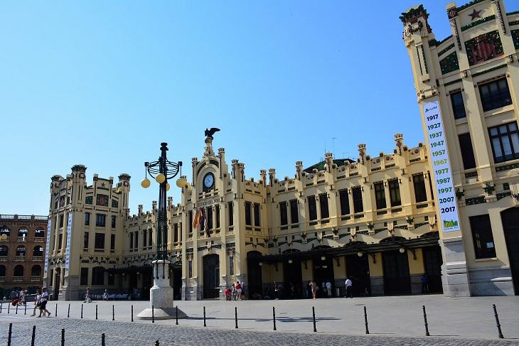 バレンシアの北駅は、今年で築100周年を迎えたバレンシア・モデルニスモ様式のかわいらしい駅舎が特徴です。外壁上部をよーく見てみてください。オレンジがたくさん付いているんですよ。切符売り場のあるホールはモザイクが美しく、ここにもオレンジがあちこちに。近代的で無機質な昨今の駅舎とは違い、バレンシアらしさにあふれた素晴らしい建築物です。