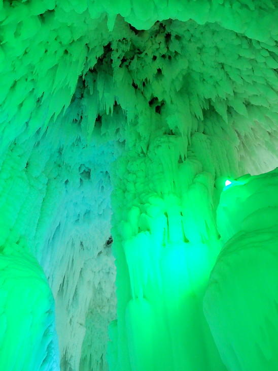 ライトアップされた氷の鍾乳洞や氷柱を見ることができます。