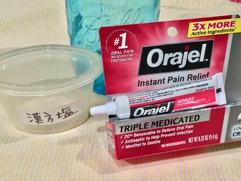 と言う訳で、木曜日の夜に歯が痛くなり翌日は休診日で週末月は予約がいっぱいで火曜日の午後、4日間を薬でしのがなければならない。 以前チー先生は「歯が痛くなったら、1カップ(250CC)の水にお塩ティースプーン一杯の塩水でリンスするといい」 と言って薬を出さなかったのを思い出した。 世界最先端の医学の地で学んだとは思えない古風な一言だったが、日本のお土産で珍しい塩があったので塩水作って痛い方を中心にうがい。 この塩水かなりしょっぱいですが結構効きました "温故知新" もう一つはいつ買ったか覚えていない 『オラジェル(Orajel)』 には、Toothache(歯痛)、 Pain Relief(痛みを和らげる)って書いてあった。 これほとんど使ってない状態、当時は相当役に立っていたはずだ。