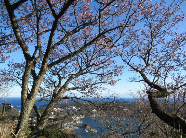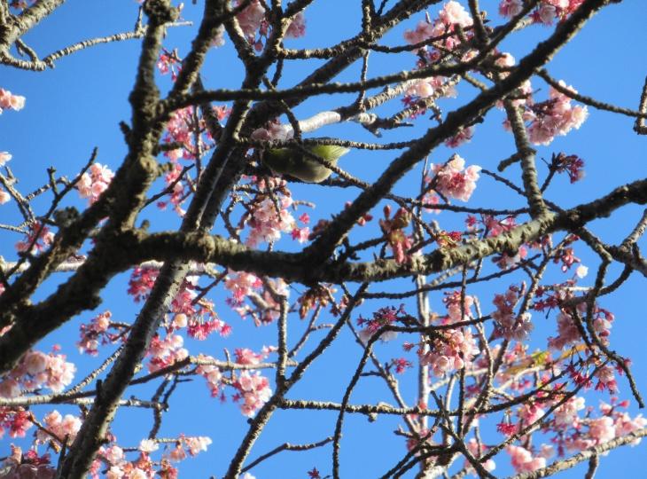 伊豆急下田駅より徒歩1分の下田ロープウェイに乗りのぼっていきますと、寝姿山自然公園があり、現在寒桜がみごろを迎えています。この寝姿山自然公園は、眼下に広がる下田湾の絶景や恋愛と縁結びのパワースポット「愛染明王堂」がみどころです。この日は、寒桜にたくさんのメジロが飛び交っていました。