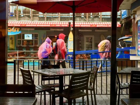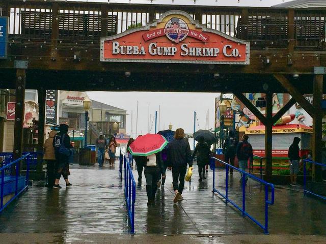 雨の日、フィッシャーマンズワーフでのポンチョと昼ごはんの写真。
