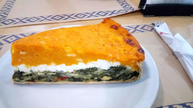 上の写真のタルタも三食パイで、ほうれん草のようなふだんそうacelga、そして、カッテージチーズqueso ricottaにカボチャcalabazaの三層でとてもおいしく