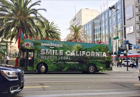 ユニオンスクエアの2階建観光バス『Weed is Legal(マリファナは合法)』とマリファナ(大麻)の葉っぱのラッピングバス。 Weedは雑草の意味だけど、マリファナのスラングでもある。 今年から処方箋がなくても21歳以上で一定条件を満たせば所持解禁になったカリフォルニアだ。 運転しながらマリファナを吸うのは飲酒運転同様禁止だけど、合法化されてから交通事故が増えたという他州からのニュースも気になる。