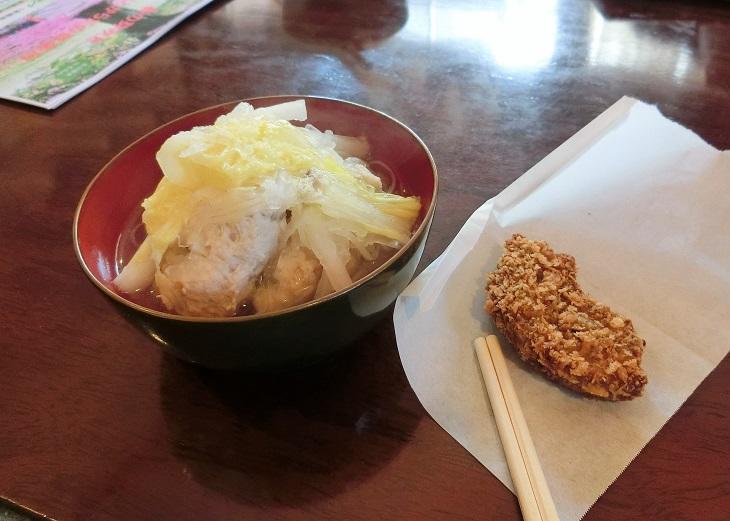 明野町の『ホタル食堂』の鶏だんご鍋と車麩のカツです。柚子が効いたお鍋、美味しかったです。