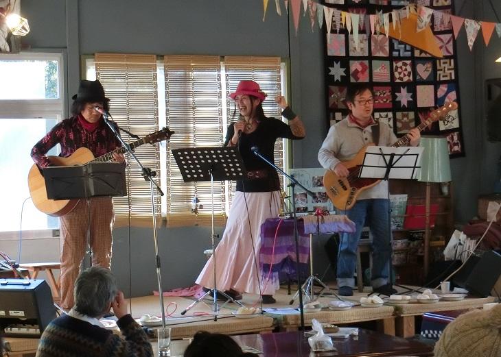 ライブが始まりました~アコースティックユニット『KURI(katsu&miho)』が、こたつdeマルシェの雰囲気に合わせて、なつかしの昭和や世界の名曲を特別にアレンジして歌う「裏KURIライブ」です。しっとりと「ふるさと」から。(ライブチャージ2000円)