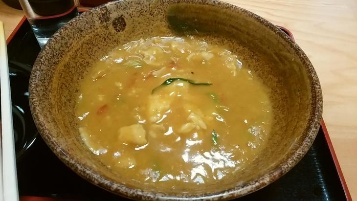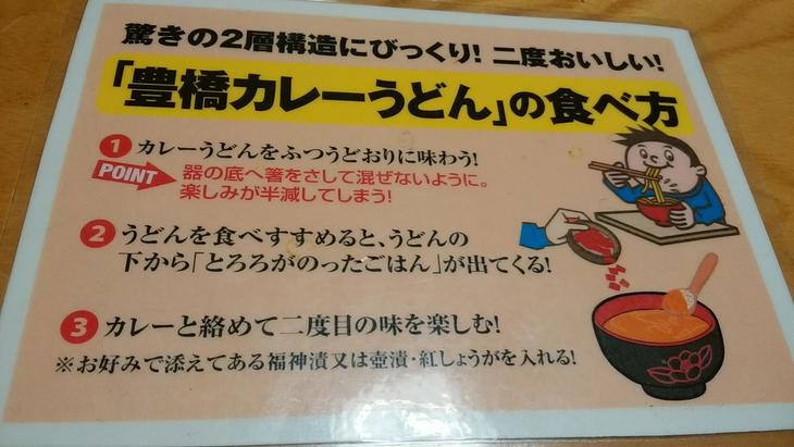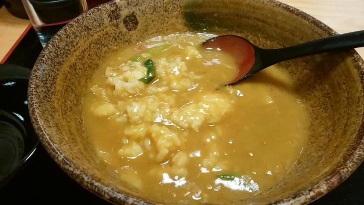お店に入って初めて豊橋カレーうどんの何たるかを知ったのですが、カレーうどんの中にとろろご飯が埋め込んであります。食べ方としては、まず普通にカレーうどんを食べ、うどんを食べ終わった後に底にあるとろろご飯を掘り起こしてカレーまみれにして食べます。カレーの量がかなり多いのが特徴です。