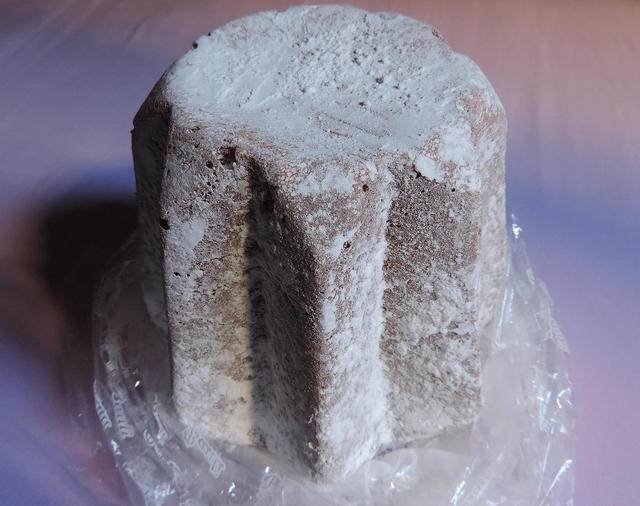↑ 別添えの粉砂糖を、パンドーロの入っているビニール袋の中に開け、袋をしっかり閉じて両手で抱えて振り、パンドーロの表面にまぶして行きます。パンドーロが冷えていると砂糖が良くくっ付かない為、もし触ってみてあまりにも冷たい様ならば、暖房やこたつの傍で少し温めても良いです。筆者はパンドーロの入ったビニール袋を振る時は、頭の中でパンドーロに美しい白い粉雪が積もって行く様子をイメージしています!