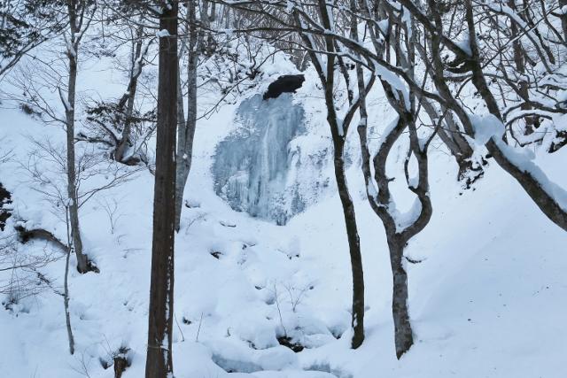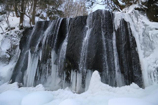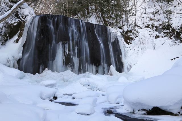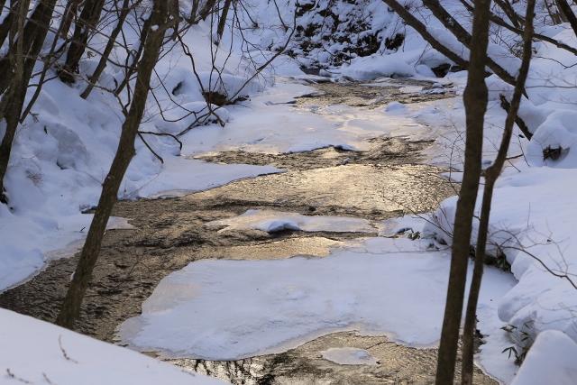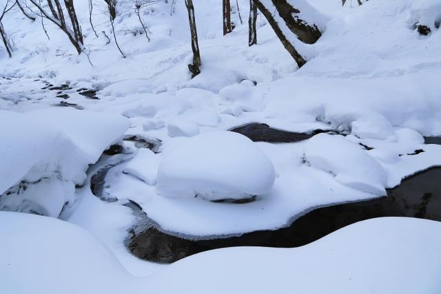 男滝から続く川の流れです。氷の上にモフモフの雪が積もっています。