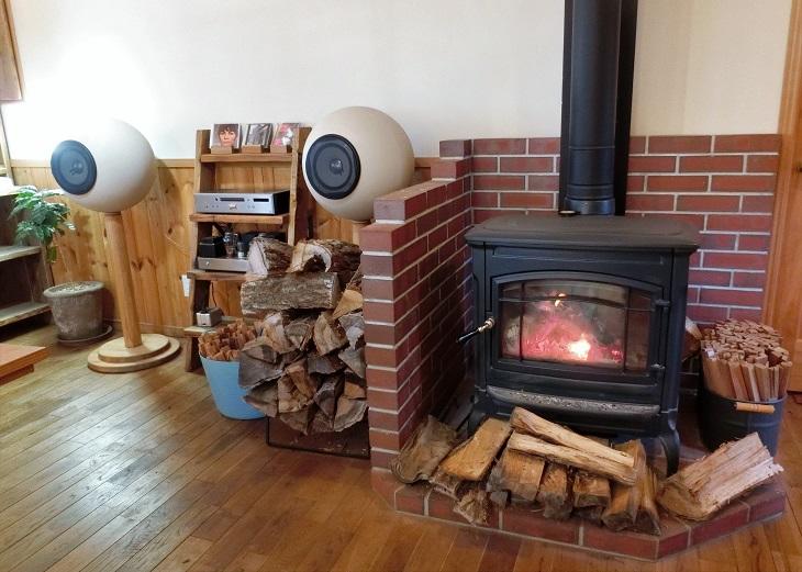 薪ストーブも暖かく燃えていました。インパクトのある丸い形のスピーカーの横には、珈琲の木も。