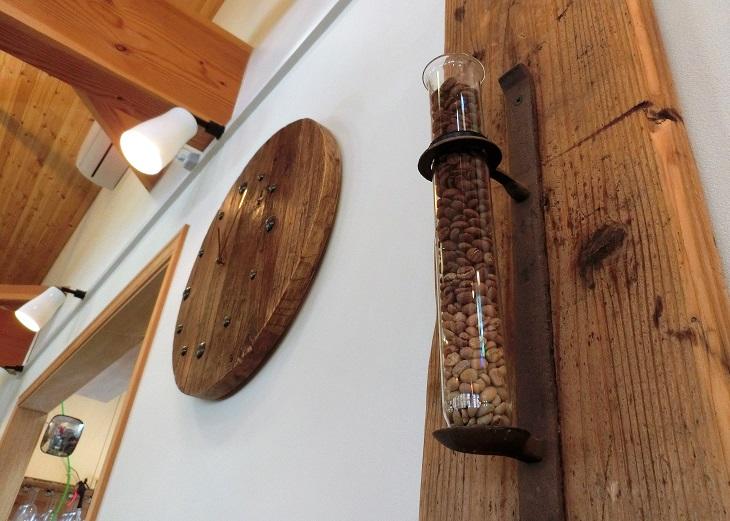 木の時計の横には、珈琲豆が入ったオブジェが飾られています。このグラデーションは、生豆から深入りの豆までの色の違いを表しているそうです。