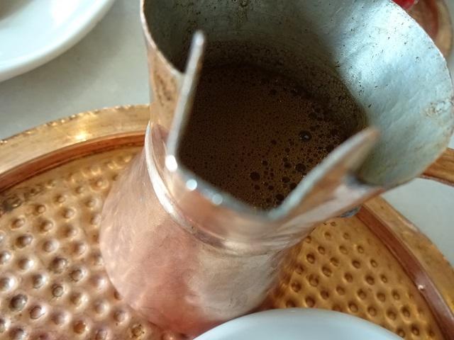 こんなプレゼンで運ばれてきましたよ。銅製の小鍋で1人分ずつ沸かすのが、ギリシャ式の特徴なんだそうです。(なお隣国トルコでも同じスタイルが浸透していますが、お互いに独自文化と主張するのが隣国あるある?かもしれないですね)