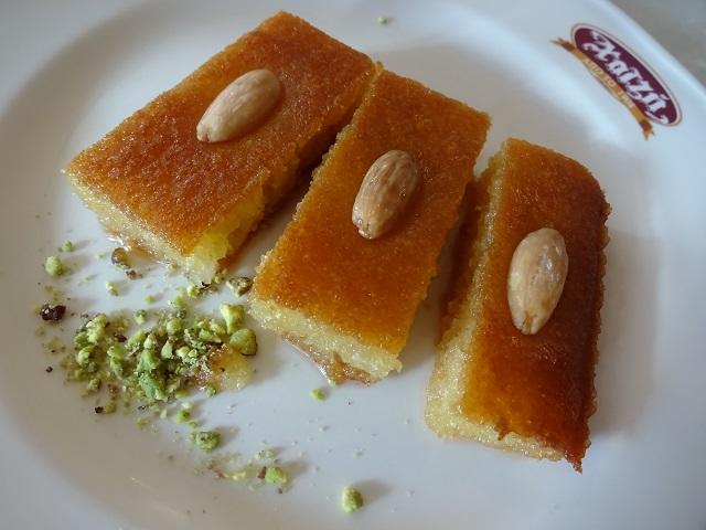 甘党の相棒は、サマリというスィーツも頼んでいましたよ。セモリナ粉とアーモンド粉の焼き菓子に、マスティーク風味のシロップがかかっています。