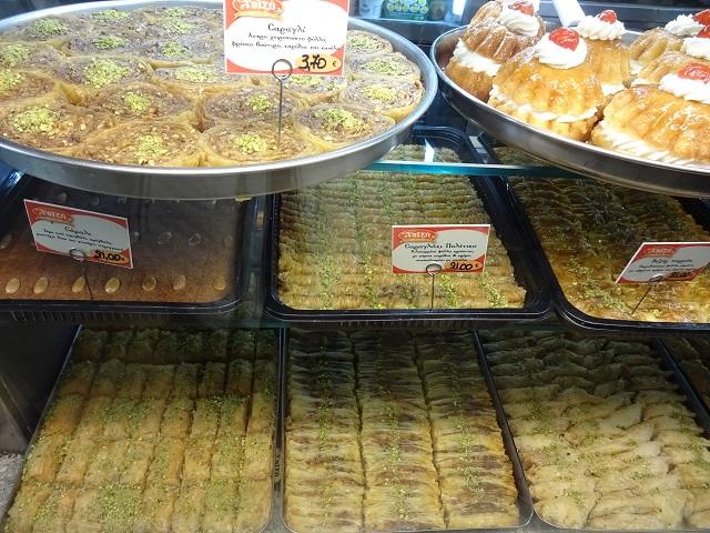 あるとき相棒が「まだギリシャ式コーヒーを味わっていないだろう?」と言うので、この「チャツィス:Chatzis」というカフェに入ってみたのです。入口すぐのガラスケースに並ぶ、沢山のスィーツが魅惑的!