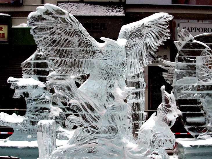 「Happy Birthday! Hokkaido」 をはじめとする氷像が並びます。