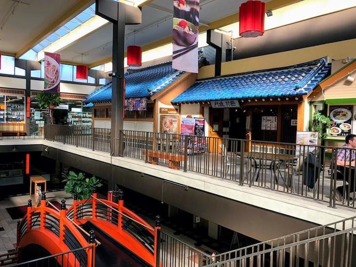 モール内には赤い橋など日本らしい内装が施されており、軽く散策を楽しめます。2階部分には沖縄関連の商品を売るニッチなお店もありますよ。このモールはこのまま東に建つ「カブキホテル」まで続きます。