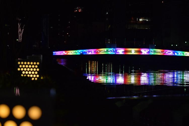 藍場浜公園から移動して、こちらは新町川に架かるふれあい橋の「虹のラクーン」です。他に、両国橋・新町橋・春日橋にLED作品があり、フェスティバル期間中だけではなく、普段から17時より点灯されています。