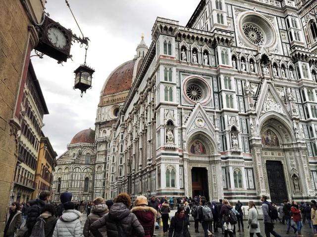 ↑ 花の都フィレンツェ。ドゥーモの大きなクーポラが顔を覗かせています!市役所は9時からなので、まだ朝も暗いうちにローマを出発しました。この時間帯の列車は、都市から都市へと観光に移動するツアー客の乗車がとても多いです。