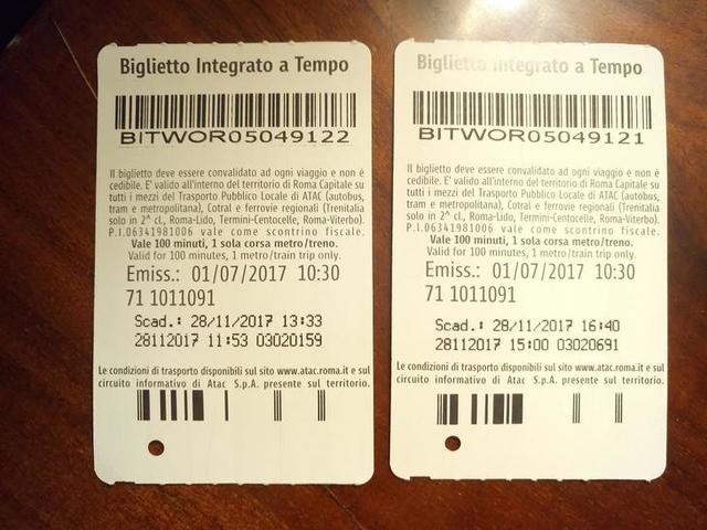 ローマでは、ATAC(アタック Agenzia per i Trasporti Autoferrotranviario del Comune di Roma )と言う公共交通会社が市バス、トラムなどを管理しています。1回券の切符(BITと呼ばれる)はこちらの上の写真のもので、1枚1.5ユーロで100分間有効です。この時間内ならバス、トラム、地下鉄、鉄道が乗り放題です。但し、地下鉄と鉄道は1回のみです。改札を出なければ乗換えは何度でも可能です。