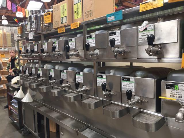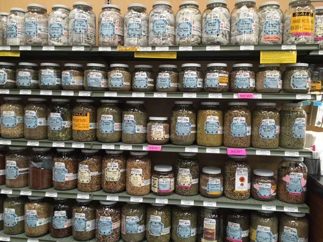 レインボーグロッサリーに入って直ぐに目に付くのが目の前に広がる量り売りセクションです。スパイスはもちろん、ハーブティーから小麦粉などの粉類・豆類・ナッツ類など大きなジャー容器に入れられた量り売り用の食材が所狭しと並べられています。